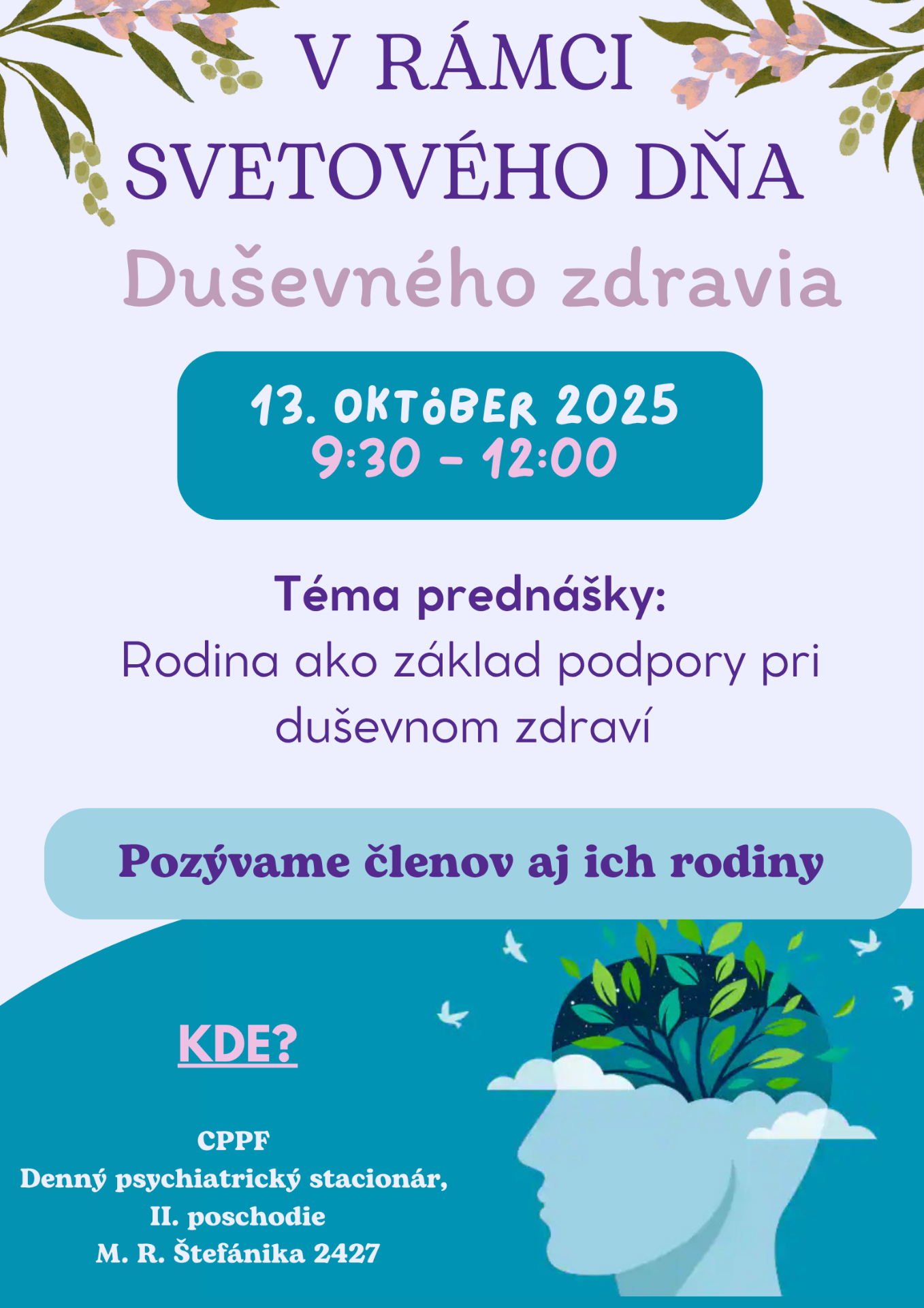 Dňa 13. októbra 2025 sa v našom Dennom psychiatrickom stacionári uskutočnila prednáška pri príležitosti Svetového dňa duševného zdravia. Témou tohtoročnej prednášky bola "Rodina ako základ podpory pri duševnom zdraví".